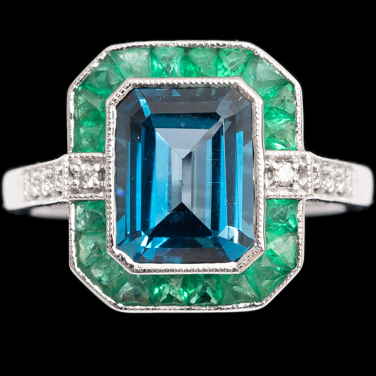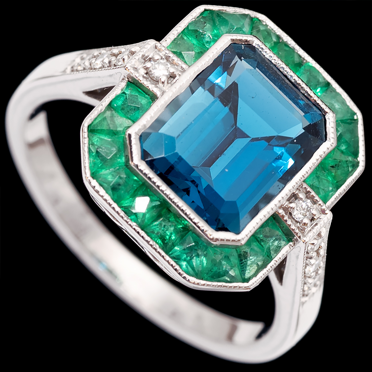 (English) 9ct art deco style london blue topaz, emeralds and diamond ring
