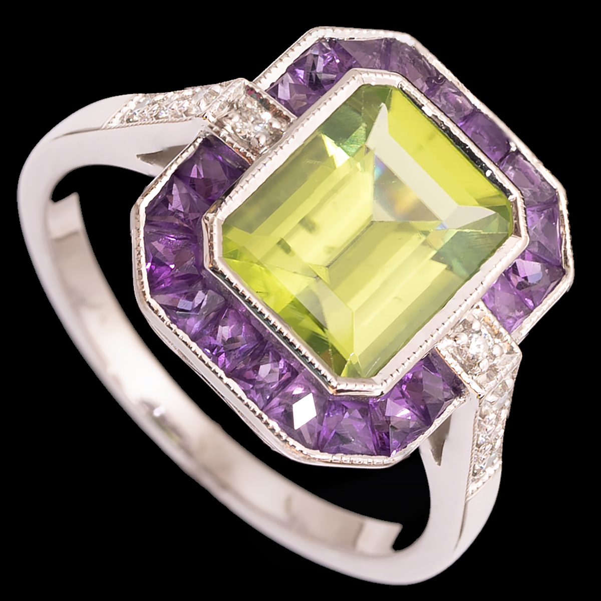 (English) 9ct art deco style peridot, amethyst and diamond ring