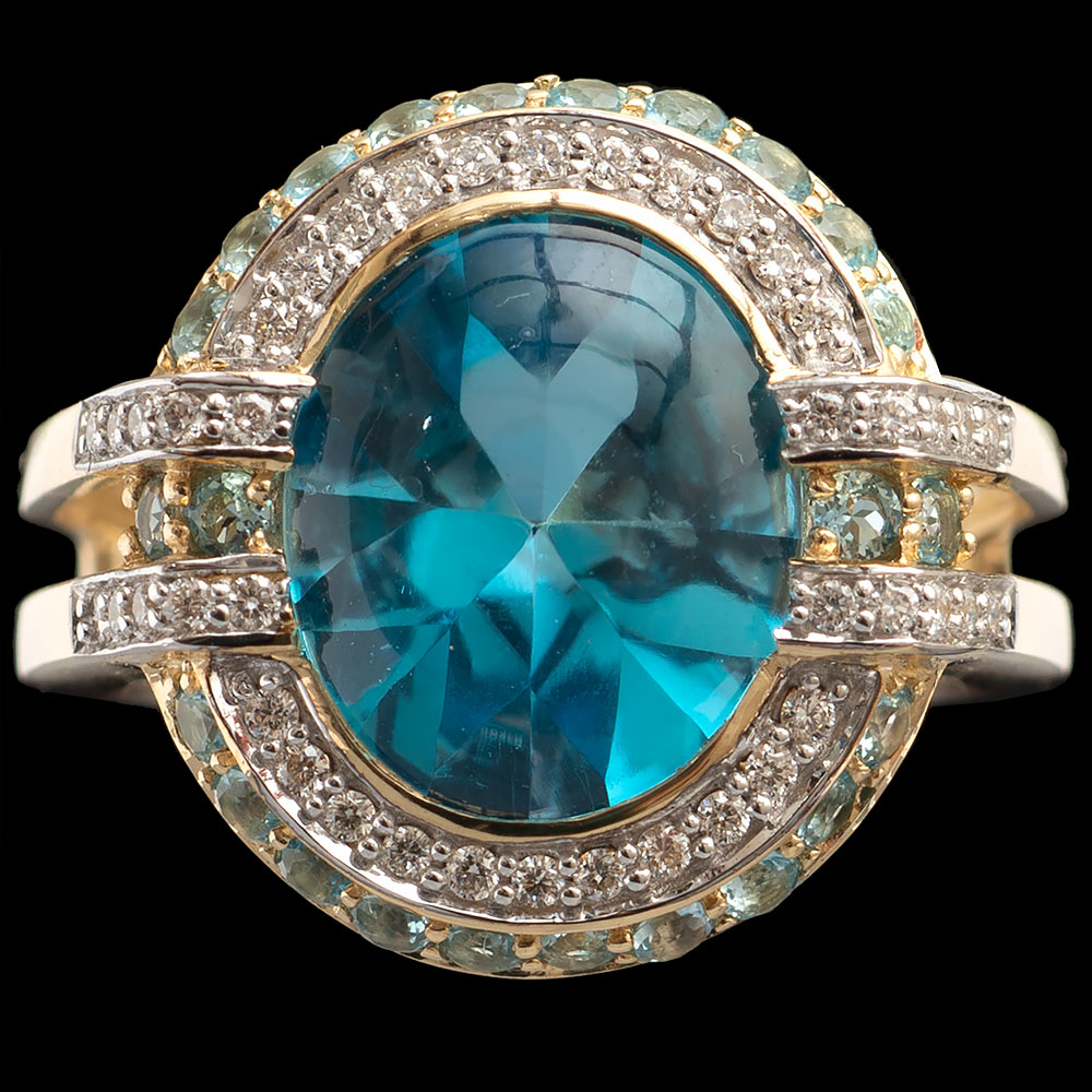 (English) 9ct cabochon cut blue topaz and diamond ring