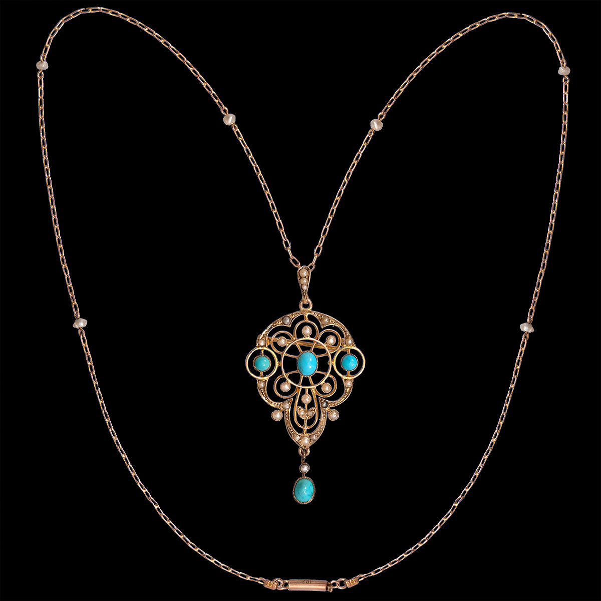 (English) 9ct turquoise and seed pearl pendant brooch on 9ct and seed pearl chain