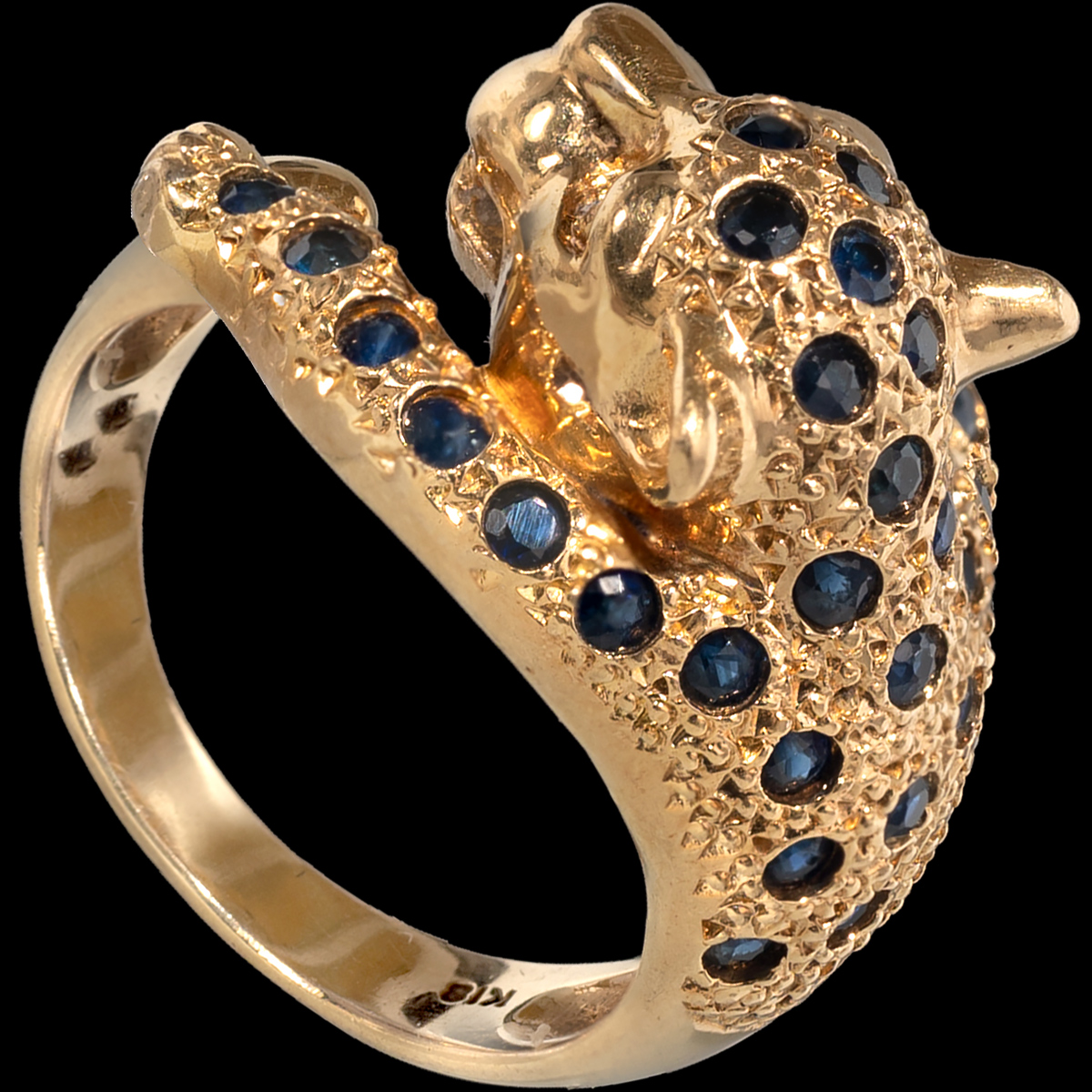 18ct and Sapphire Leopard ring with diamond eyes