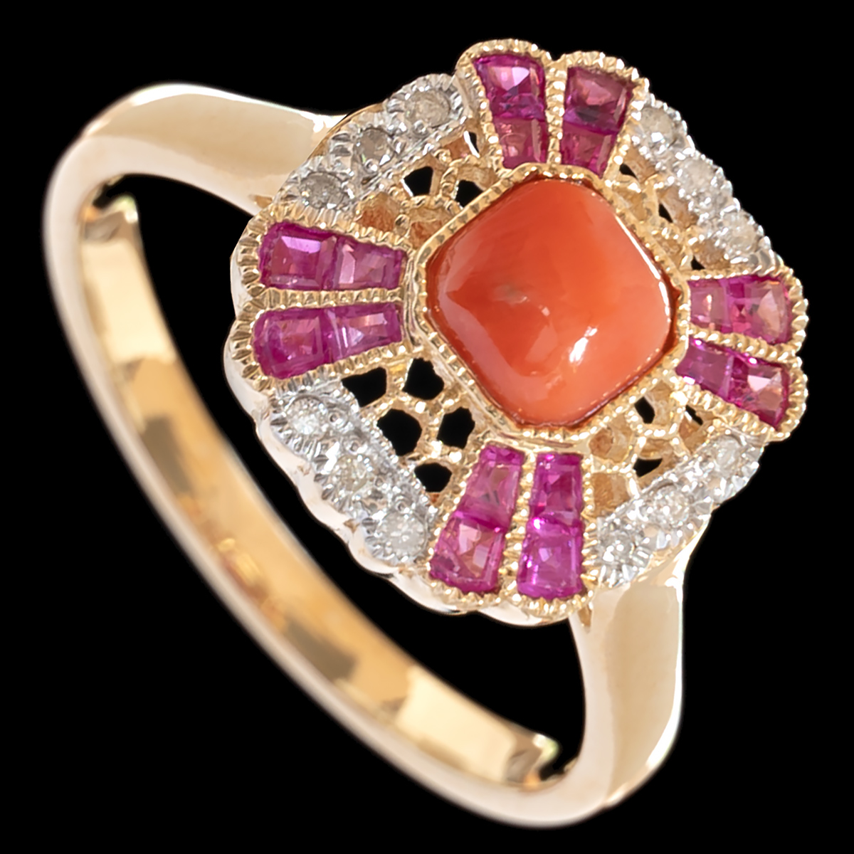 9ct ruby, diamond & coral ring