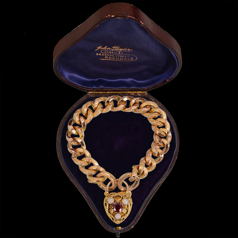 Exceptional Engraved Curb Link Bracelet with Garnet and Pearl Padlock Clasp