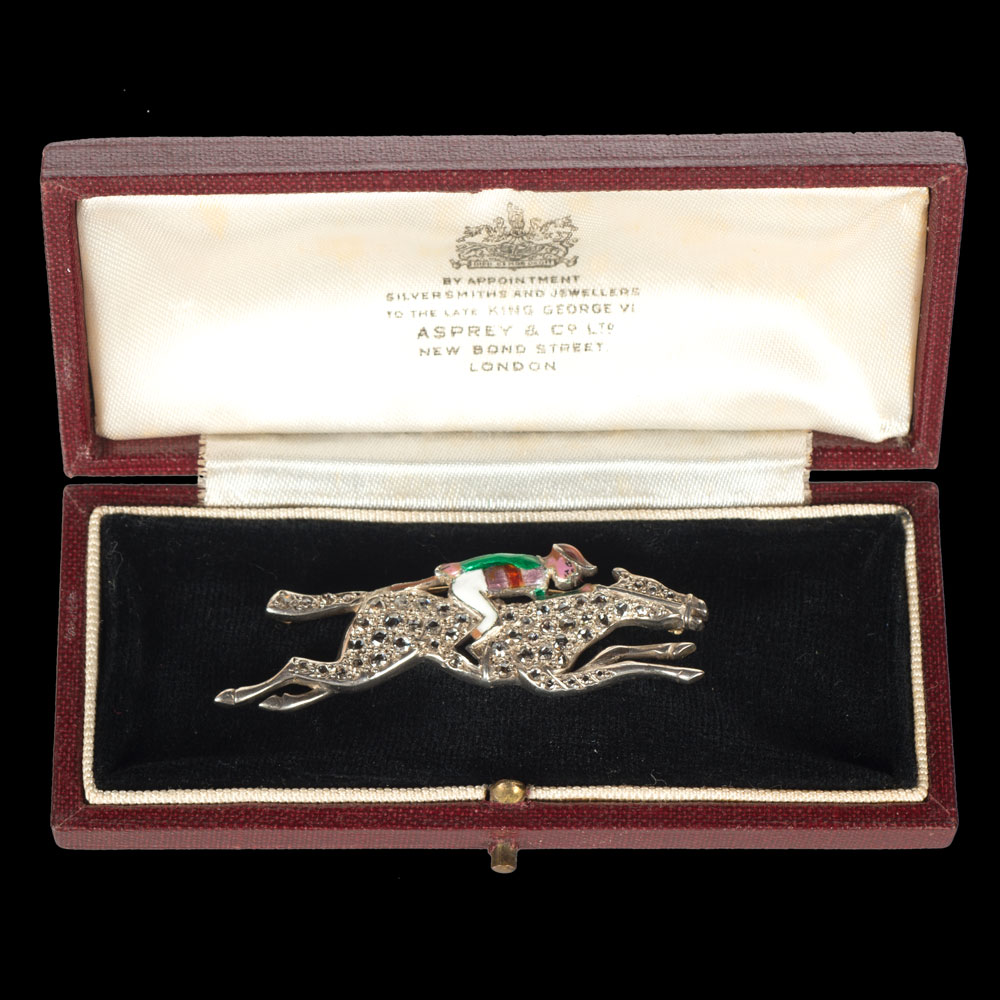 Silver Gold and Diamond Racehorse Brooch with Enamel Jockey