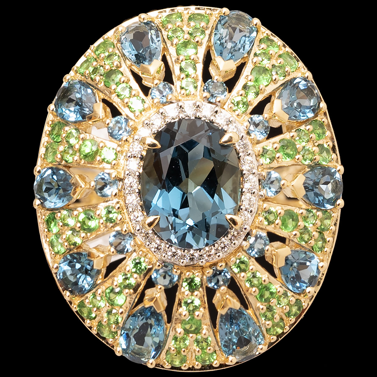 (English) 9ct London blue Topaz, Tsavorite garnet and Diamond ring